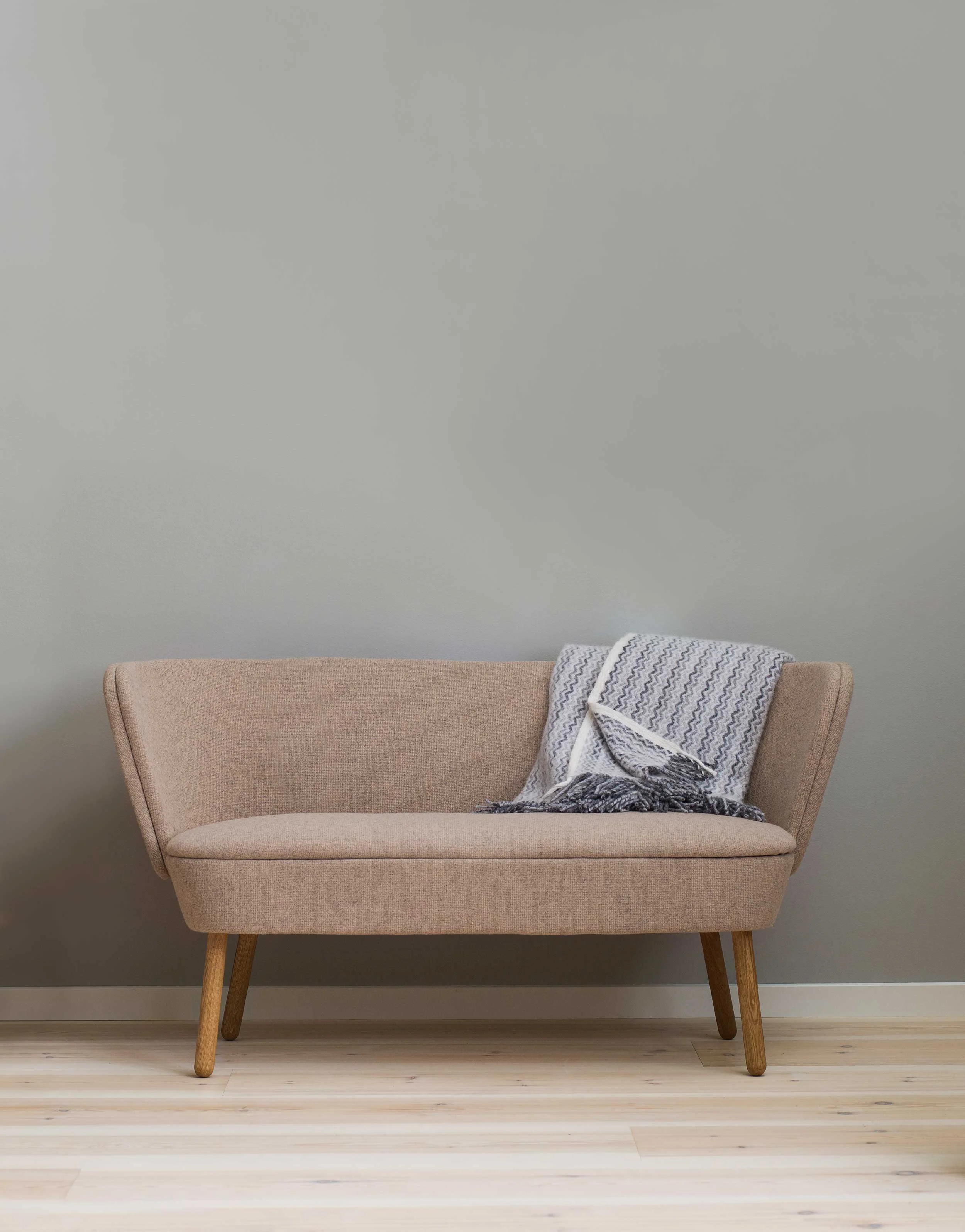 The sofa is fully upholstered. The backrest is upholstered over a wood laminate base, and the legs are made of oak. The Wrap sofa is available in a range of fabrics and colours, and is aimed at both contract and residential markets.